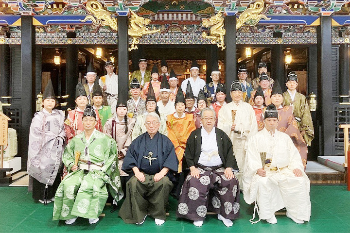 定刻、古式に則った装束を着装し、社務所大玄関にて手水をとり、御社殿にて、奉納奉告祭を斎行致しました。その後、記念写真を撮影し、馬場の斎場に向かいました。