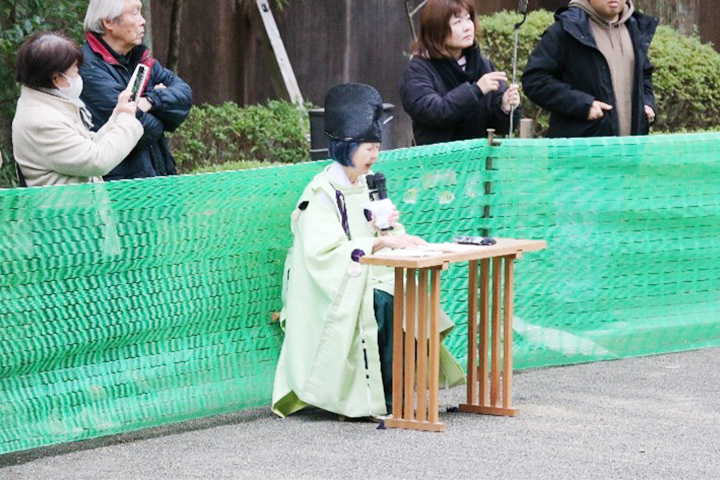舗設が終了すると、奉納式奉仕者全員による習礼を行いました。当宮からは総代の澁谷雄一殿が日記奉行としてご奉仕申し上げました。