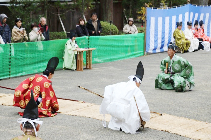 | 蟇目の儀の様子 | 行事の由来の解説や実況をして頂きました |