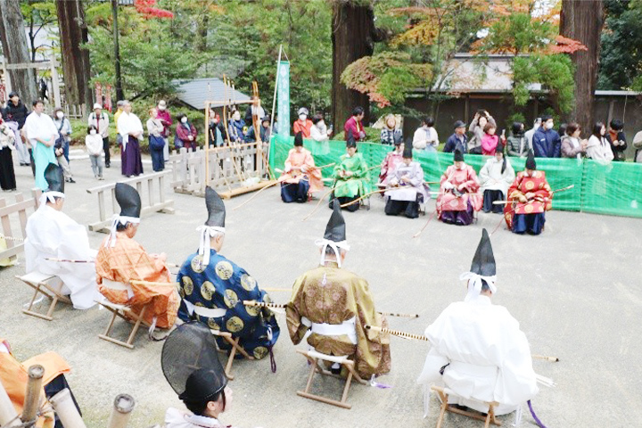 去る令和7年11月9日午後2時より、当宮馬場に於いて小笠原流「蟇目の儀・百々手式」奉納式が斎行されました。
