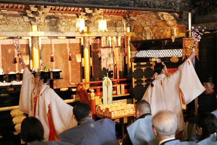 祭典は宮司一拝から始まり、神前に神饌をお供えし、宮司が祝詞を奏上致しました。祝詞奏上の後、当宮仕女による御神楽「萬代の舞」が奉奏されました。例祭では「浦安の舞」が奉奏されることが多く見受けられますが、八幡様の御分霊ということもあり、平成8年に御鎮座390年を記念して作られた萬代の舞が奉奏されました。萬代の舞では、季節の花を執り物と挿頭に使用しており、この度の祭典では桜の花を用いました。