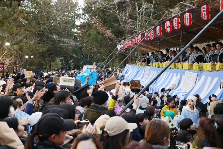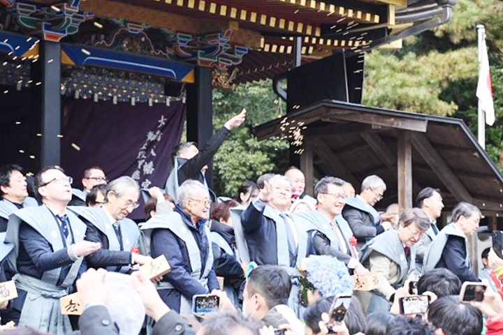 その後、馬場特設舞台にて、福物撒豆式が執り行われ、こちらも大盛況でした。「福は内、福は内、鬼は外、鬼は外、天打ち、地打ち、四方打ち、鬼の目ん玉ぶっつぶせー」とかけ声が掛けられて撒かれる当宮の習わしです。