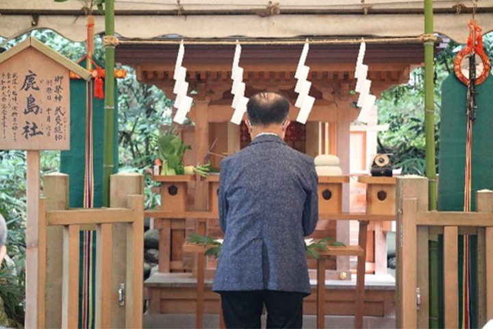 鹿島社は鎮座した詳しい年月日や由緒は不明ですが、常陸国(現在の茨城県)一之宮の鹿島神宮より分祀されたと伝えられており、御祭神は武道の祖神、決断力の神として仰がれる「武甕槌神(たけみかづちのかみ)」です。