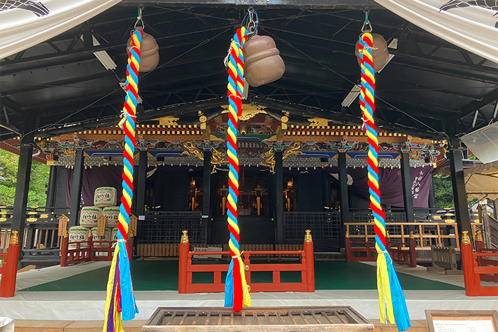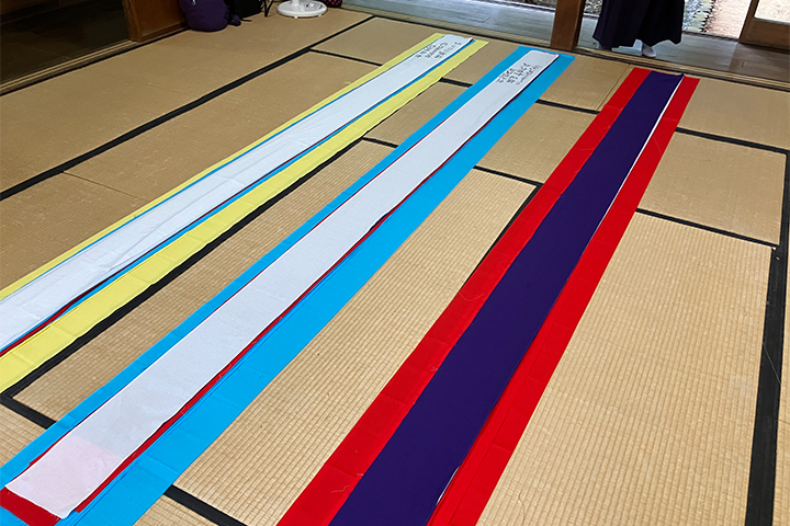 例大祭に先立ち、御社殿の前には新しい「鈴の緒」が奉納されます。赤、青、黄、白、紫の5色の布に「御祈願名」「ご氏名」を浄書後、有志の方々のご協力により、奉製された鈴の緒が御社殿前に吊るされます。