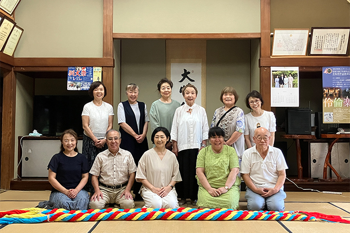 御神前へと奉納されお祓いを受けます | 出来上がった鈴の緒の前で記念撮影 |