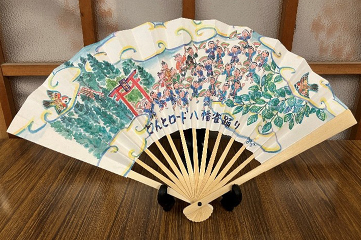 扇子の絵は仙台市青葉区熊ヶ根にて「パンりんご亭」を営みつつ、イラストレーターとしてもご活躍されている栗城みちの殿に描いていただきました。栗城殿は、事前に何度も御来社され、どんとロード八幡雀踊りの起源や八幡宮の由緒等念入りに調べられ、当宮の境内と雀踊りを踊る子供たちを天から見守る雀という、仙台らしさに溢れた大変素敵な絵を描いて下さりました。この場をお借りして感謝申し上げます。