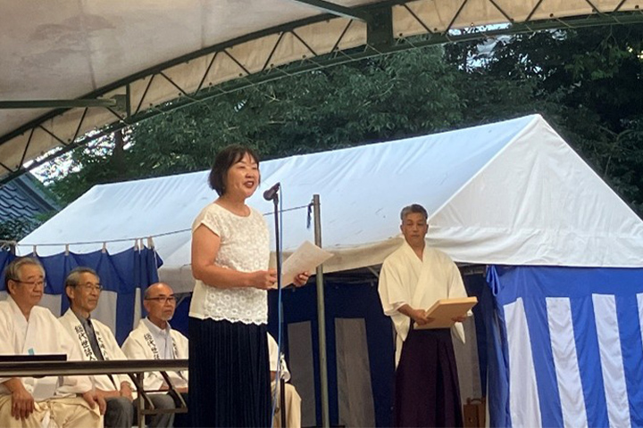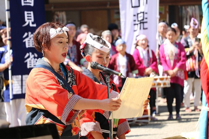 年番総代の口上の様子 | 外拝殿前での総踊りの様子 |