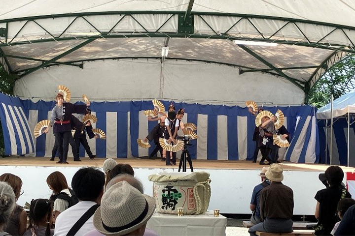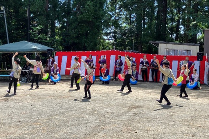 その後は一団体ずつ外拝殿前奉納演舞、広場中央舞台演舞、一之鳥居演舞、境内流し踊りを行いました。大変賑やかな光景に参拝者から大きな拍手が送られていました。