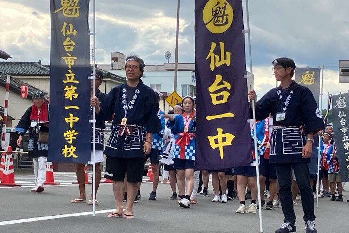 また、20回目を記念した催しとして「雀神輿」が県道の流し踊りの魁として町内を練り歩きました。雀神輿は当宮に隣接する仙台市立第一中学校の生徒の有志と、当宮の神幸祭にて若神輿を長年仕切ってくださっている世話人の方と有志の皆様にて担がれ、(株)七十七銀行八幡町支店まで巡幸しました。