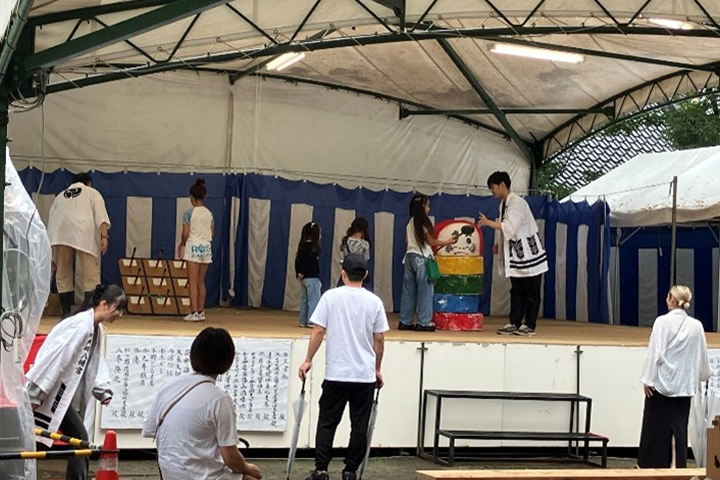 ちびっこまつりは、当宮の祭典委員会の会員と国見パパス・東北福祉大学まごのてくらぶの学生と共に運営しております。また、翌日の神幸祭の子ども神輿に参加するお子様に御来社頂き、半纏を渡す機会としての側面もございます。