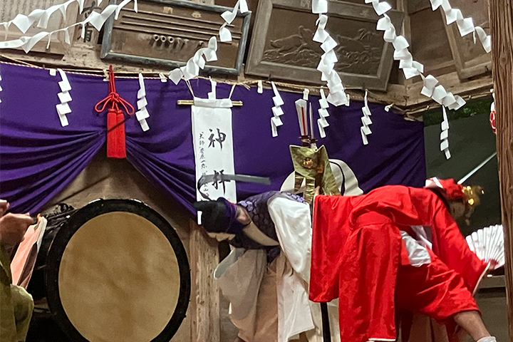 毎年、献饌式の夜には神楽殿にて当宮で大崎八幡宮の能神楽が奉奏されます。大崎八幡宮の能神楽は宮城県の無形民俗文化財に指定されており、古代より代々継承されてきた舞と楽の調べは、秋の夜空の下、神楽をご覧になられる方々を神話の世界へと誘います。