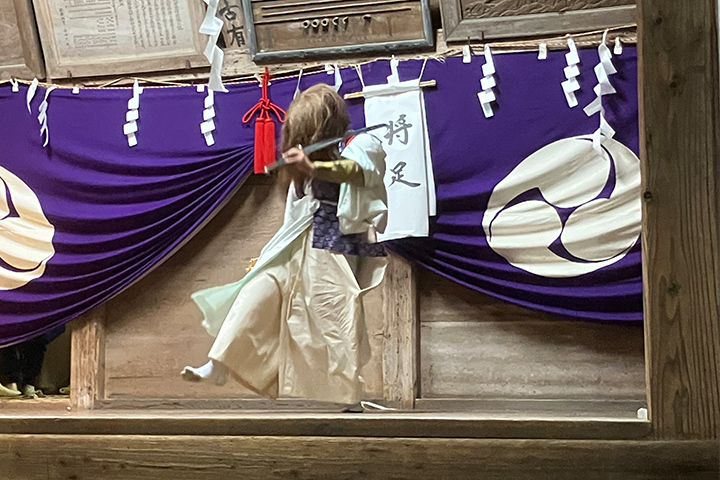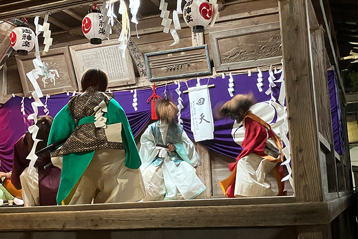 奉納演目はかつて十八番を数えたと伝えられておりますが、現在ではそのうち十番が廃絶し、「神拝」「龍天」「摩応」「小弓遊び」「三天」「将足」「四天」「獅子取り舞」の八番が演じられております。特徴は足を摺るように静かに舞う所にあり、「能」の所作に良く似ている為、「能神楽」と呼ばれております。
