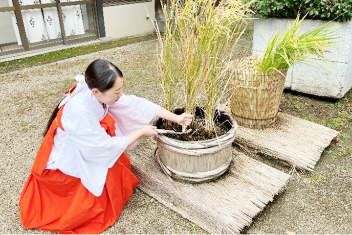 当宮においても境内にて稲作を行い、収穫を致しました稲は「荒稲(あらしね)」の神饌として御神前へ奉るとともに奉献者や参列者の方々の撤下品の御幣にもつけられました。