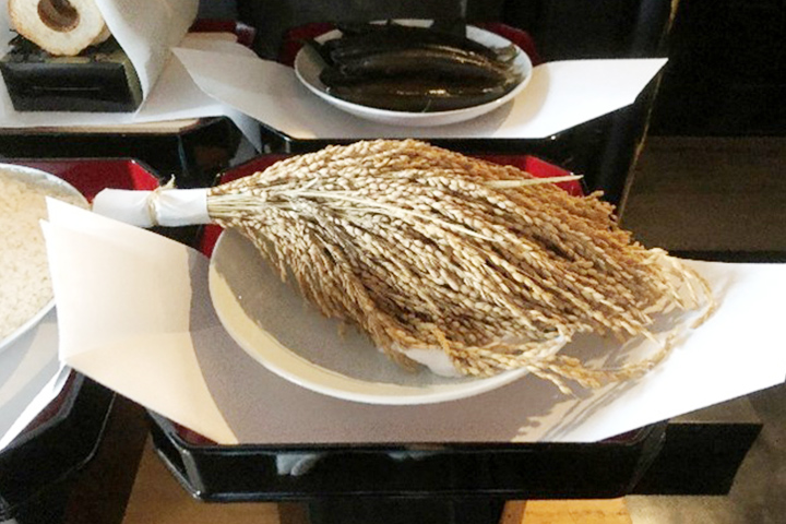 | 収穫の様子 | 神饌の最初にお供えされた荒稲 |
