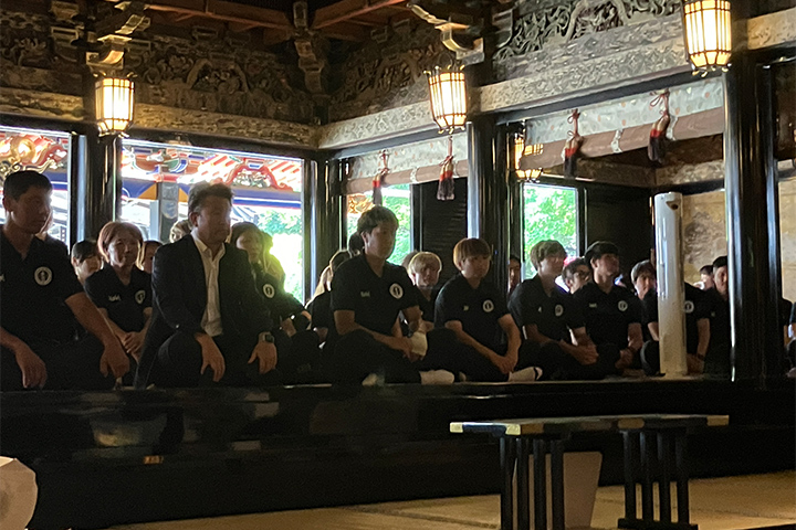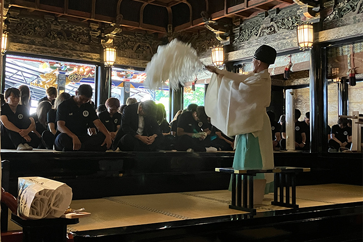 当日は留学生、引率の方含め22名が来社され、社殿内でお祓いを受け、玉串拝礼を行っていただきました。その後に宮司による社殿説明がございました。