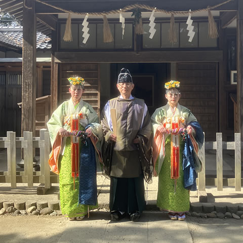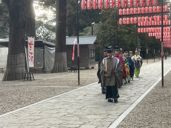 「ご縁がありまして、昨秋より祭典当日・前日等を中心にご奉仕させていただいております五十路の新人でございます。神職養成講習会では、自然に身体が動くようになるまで練習するよう指導されましたが、頭で考えないと動けなかったり、頭では分かっていても身体が動かなかったり、経験不足・練習不足を痛感しております。 各祭典の目的や意義を深く把握して広く皆様にお伝えするとともに国宝や重要文化財という形なきものを守り伝えていく重責を担えるよう精進して参ります。」